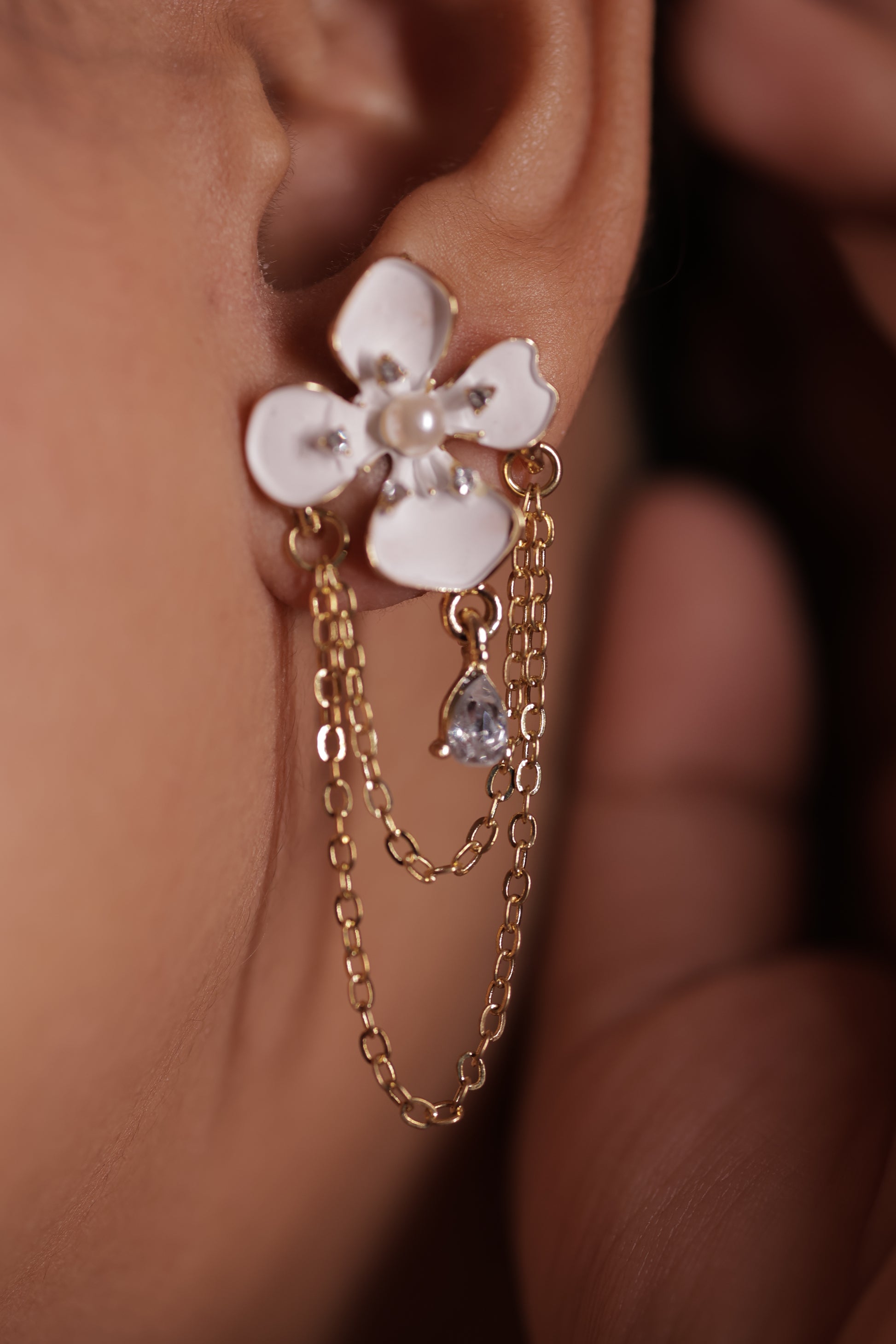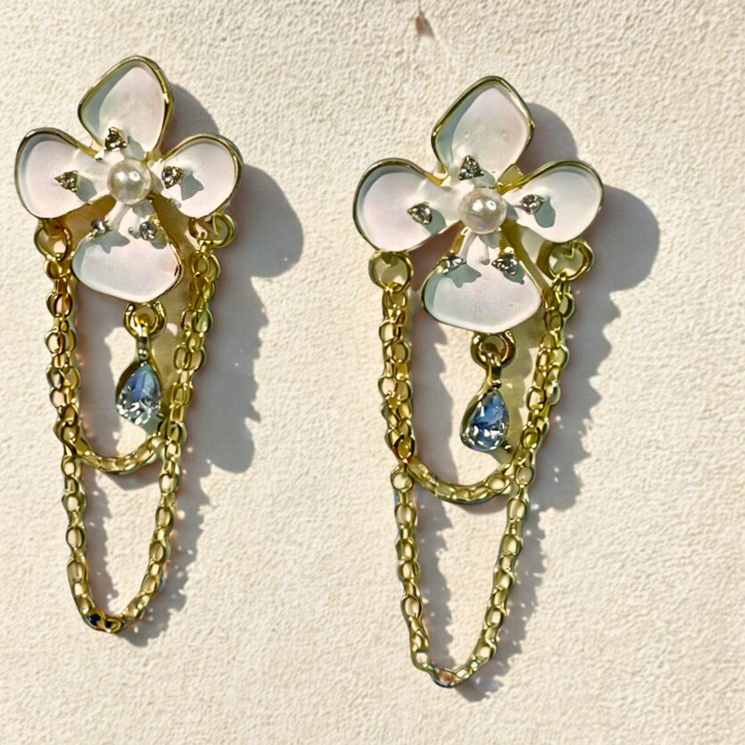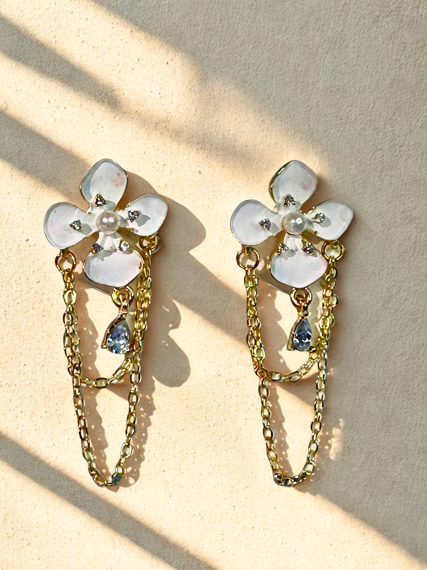 The statement plumeria flower sparkles with pearl embellishments and shimmering details. Complemented by golden hangings featuring a glittering drop, it radiates an enchanting charm.