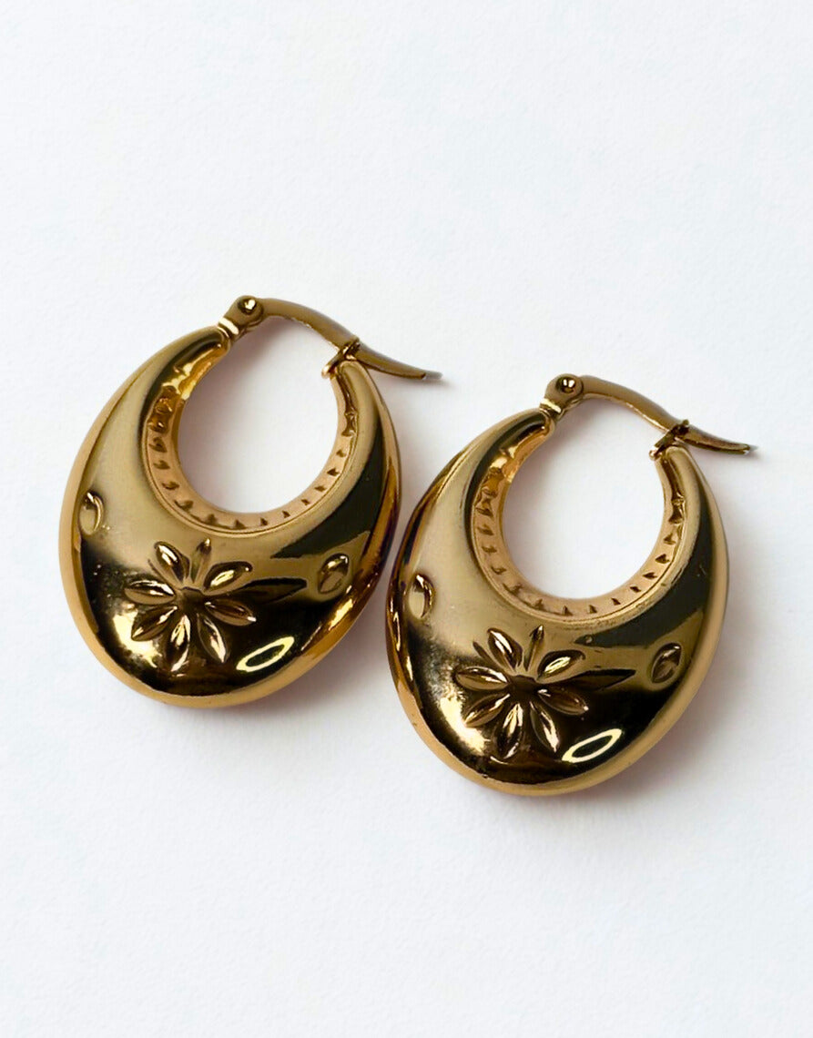 Embrace your boho spirit with these golden, anti-tarnish loops featuring unique indie-style engravings. They capture the ideal 90s indie pop vibe, making them a perfect statement accessory.
