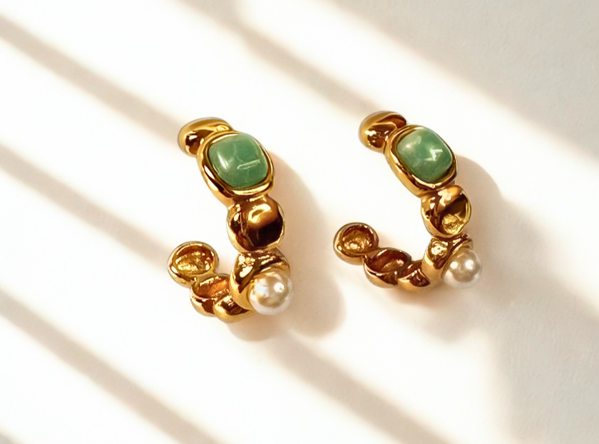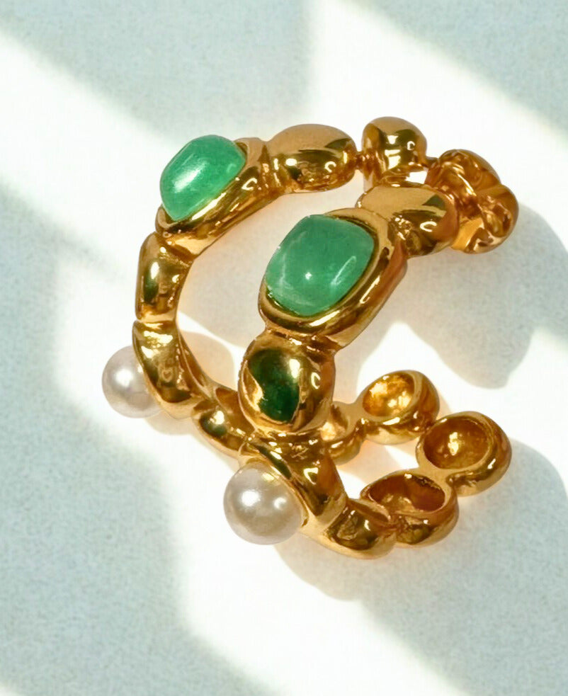 These loops offer anti-tarnish durability, enhanced by a splash of emerald green and the graceful beauty of pearls for an elegant touch.
