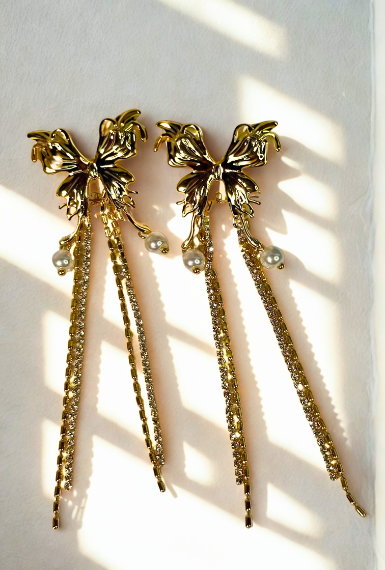 This striking anti-tarnish piece features bold butterflies accented with delicate, flowing tassels and pearl drops—perfect for those who dream of soaring higher!