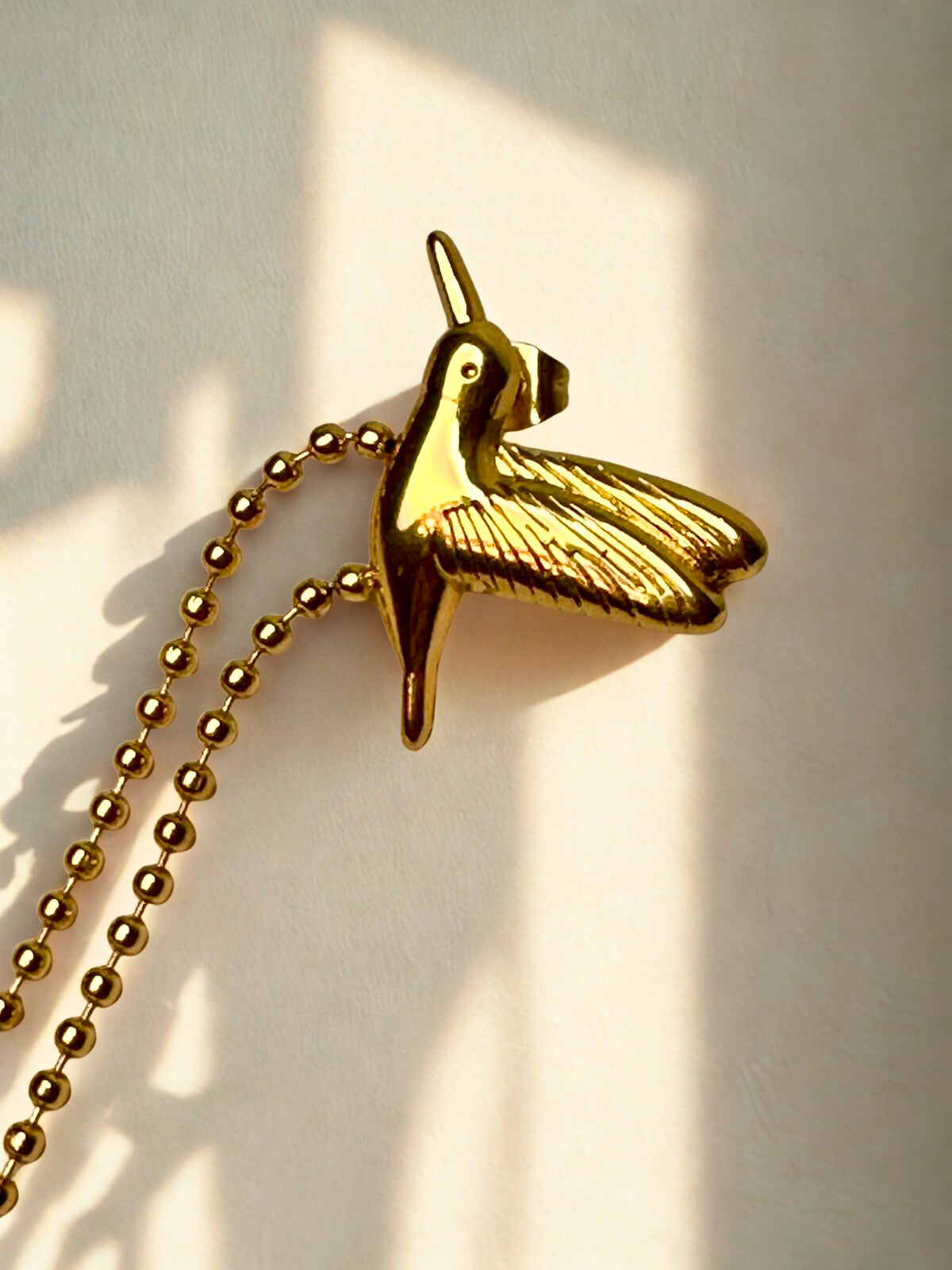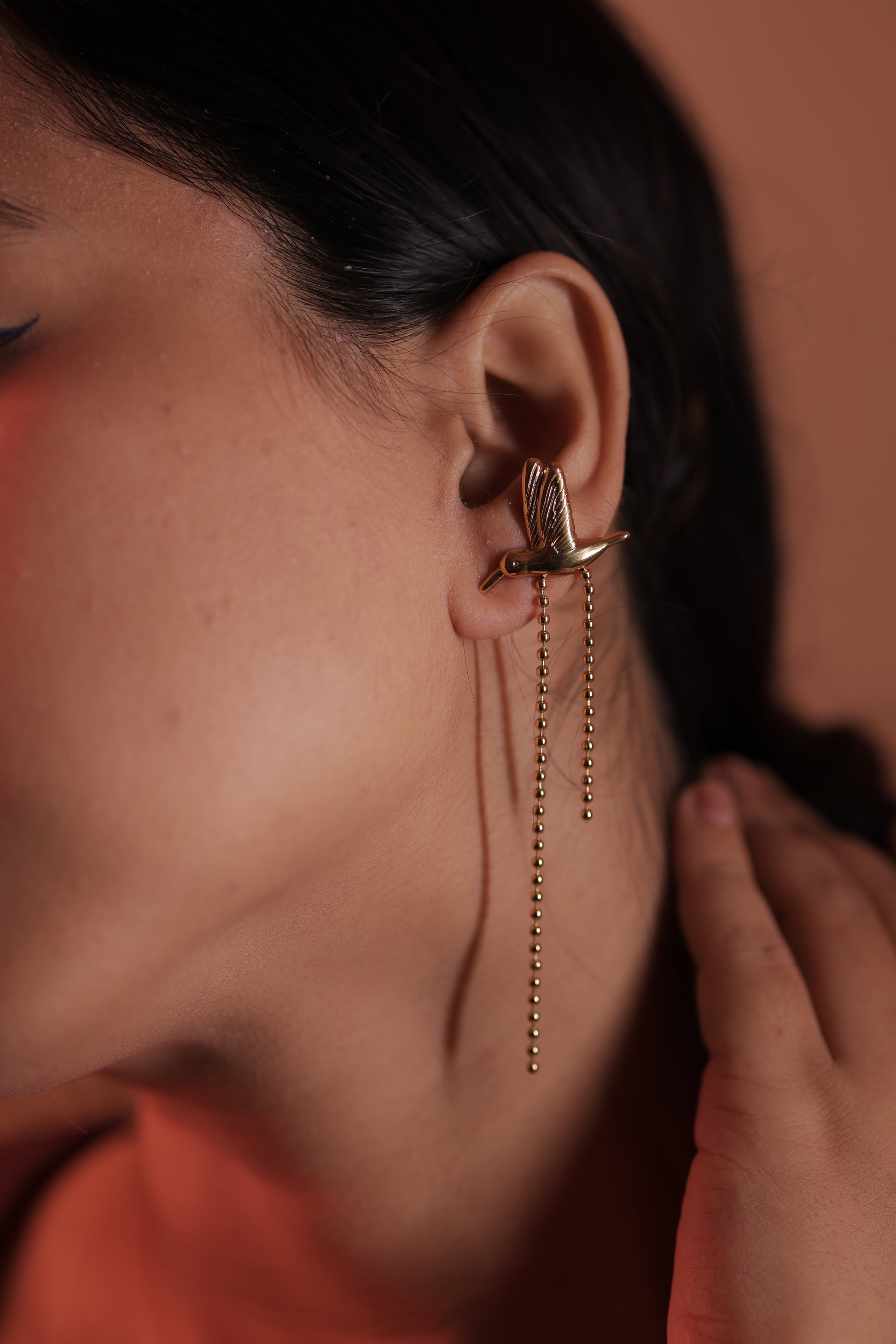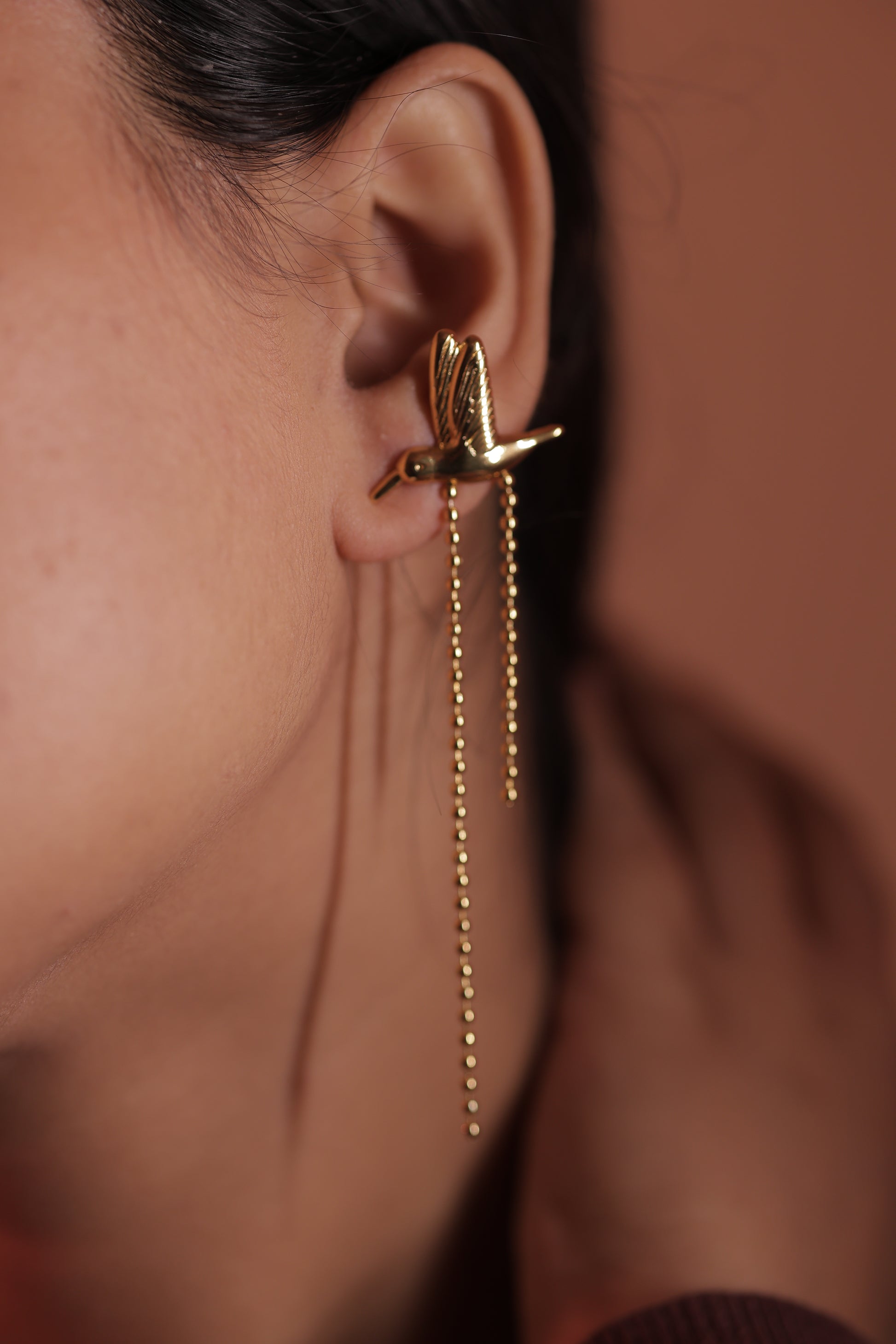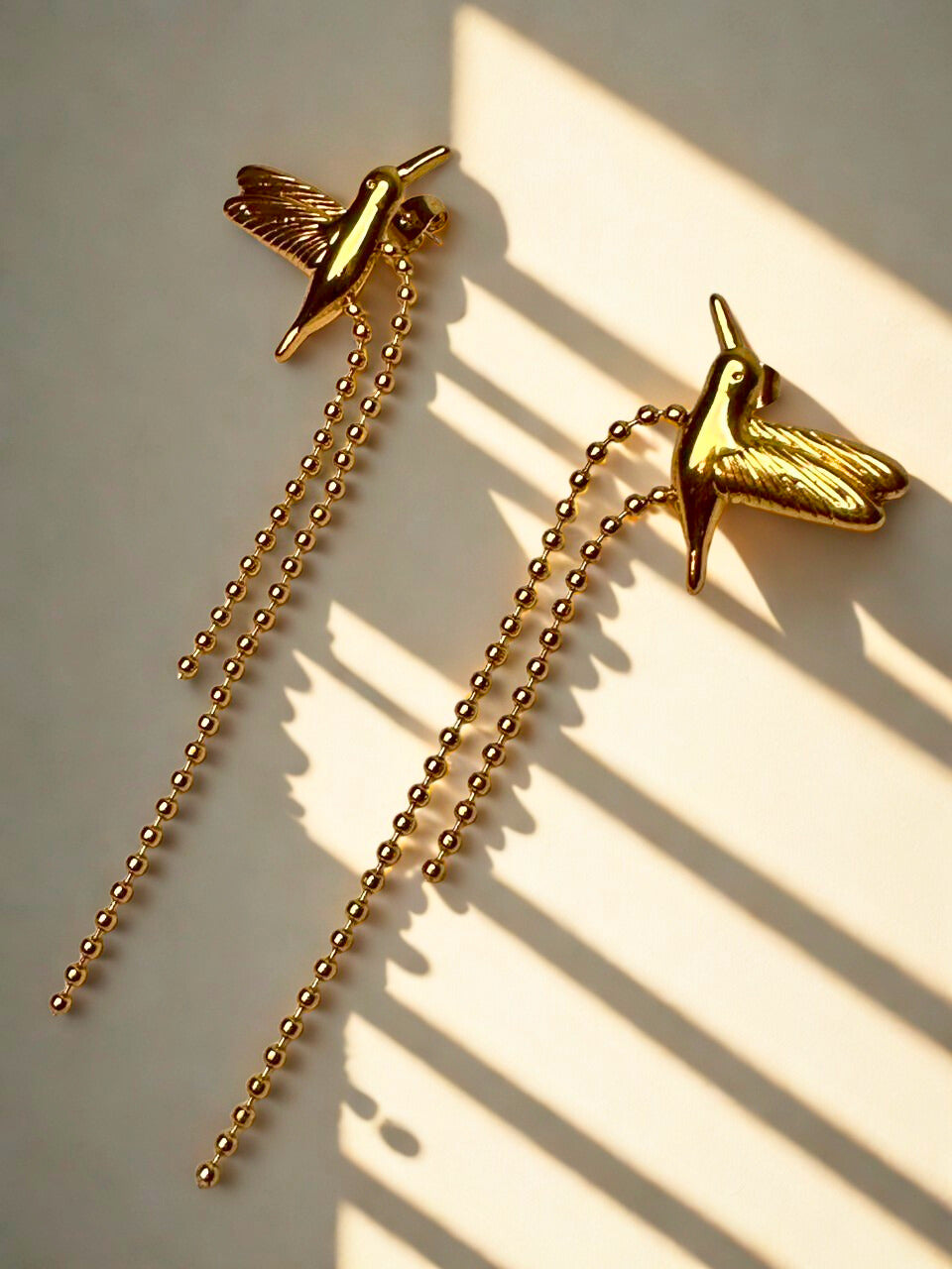 Make a statement with these anti-tarnish earrings featuring finely detailed hummingbirds and graceful golden beaded strings that represent the effortless ascent and lasting brilliance of your sophisticated glow.
