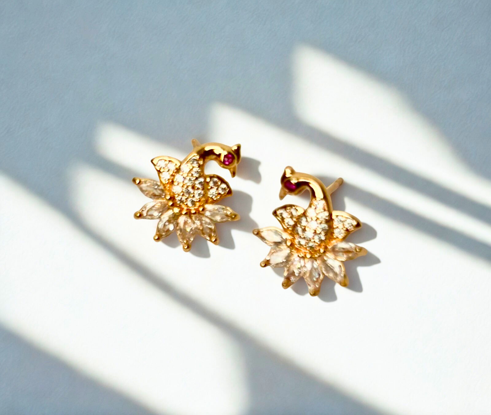 These 9.5K gold-plated studs, adorned with sparkling zircon stones, capture the timeless beauty and grace of the peacock, perfectly living up to the enchanting name—Mayuri!