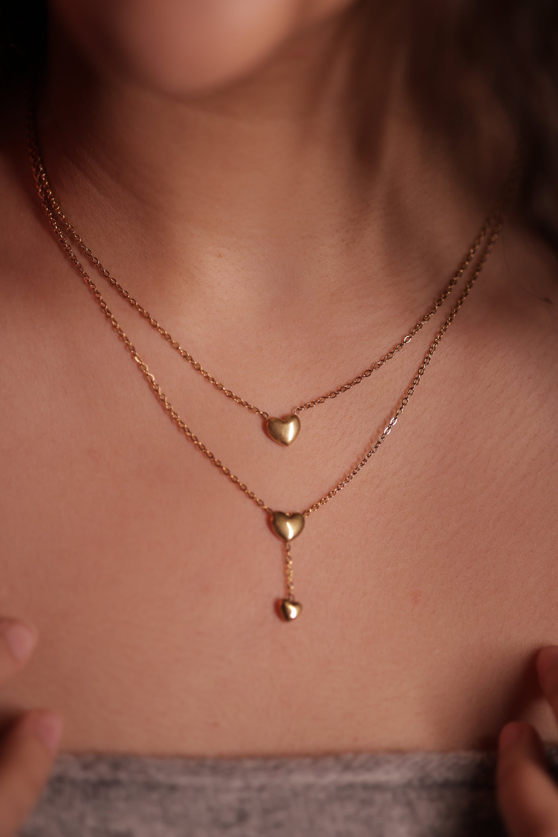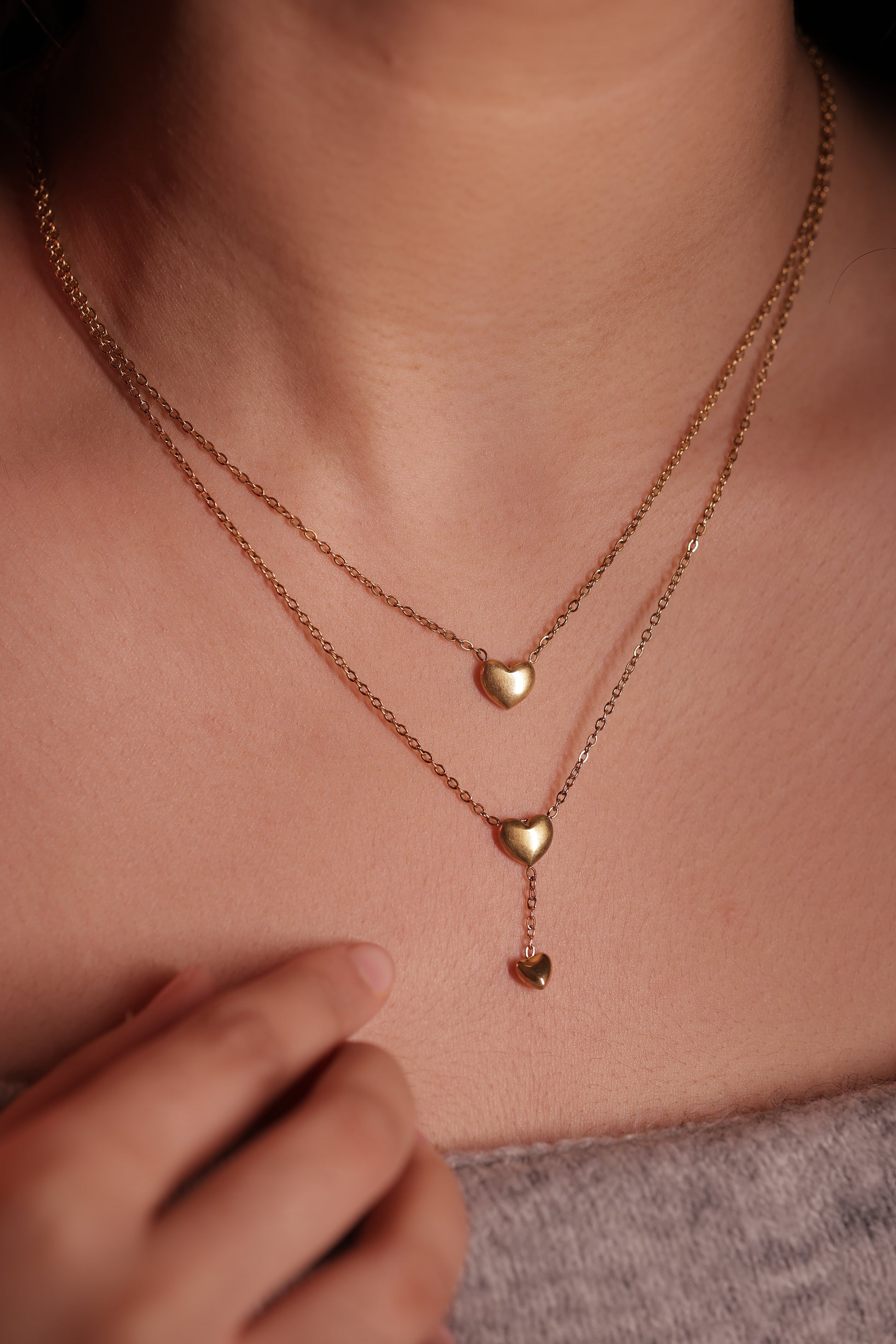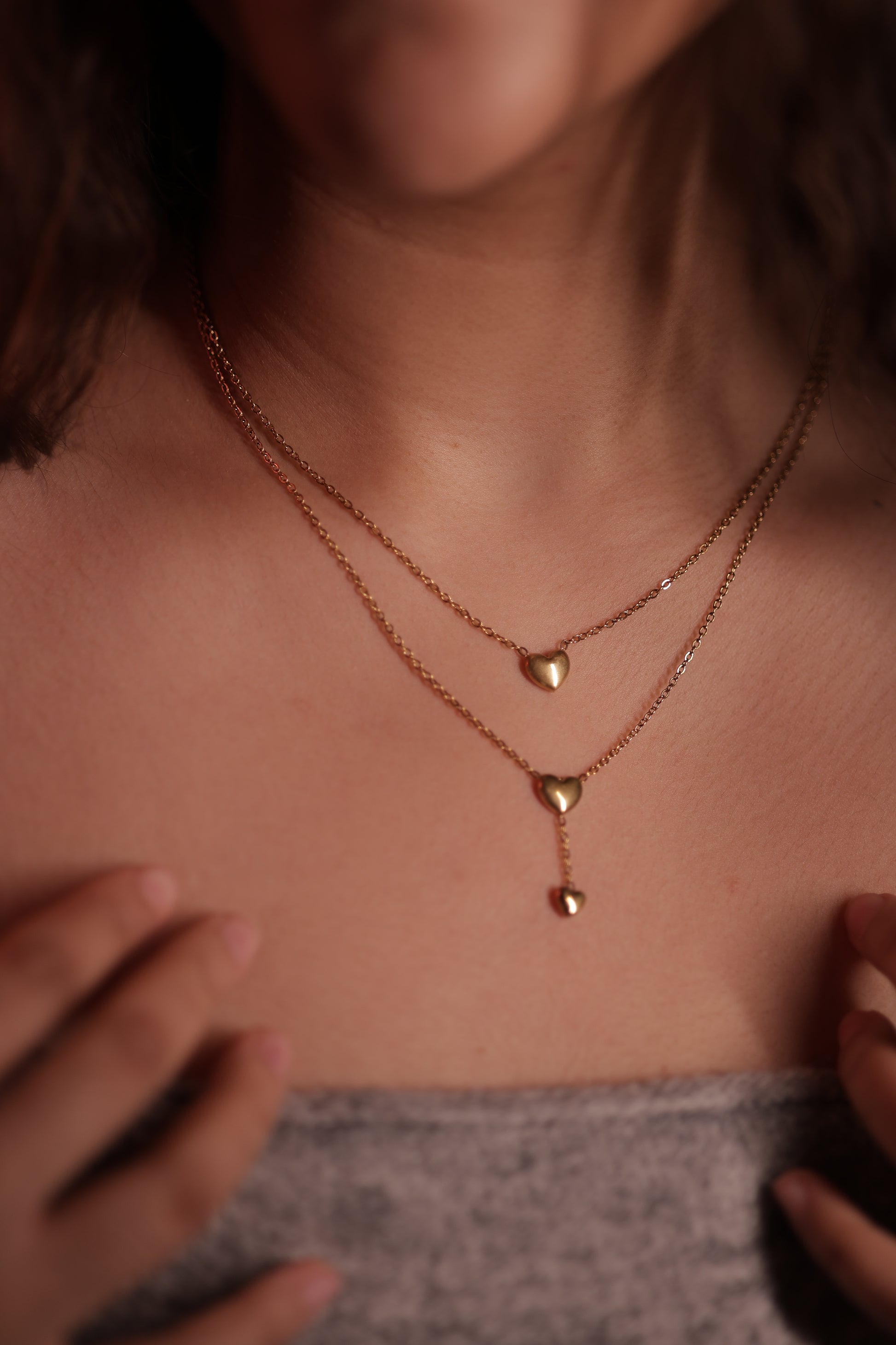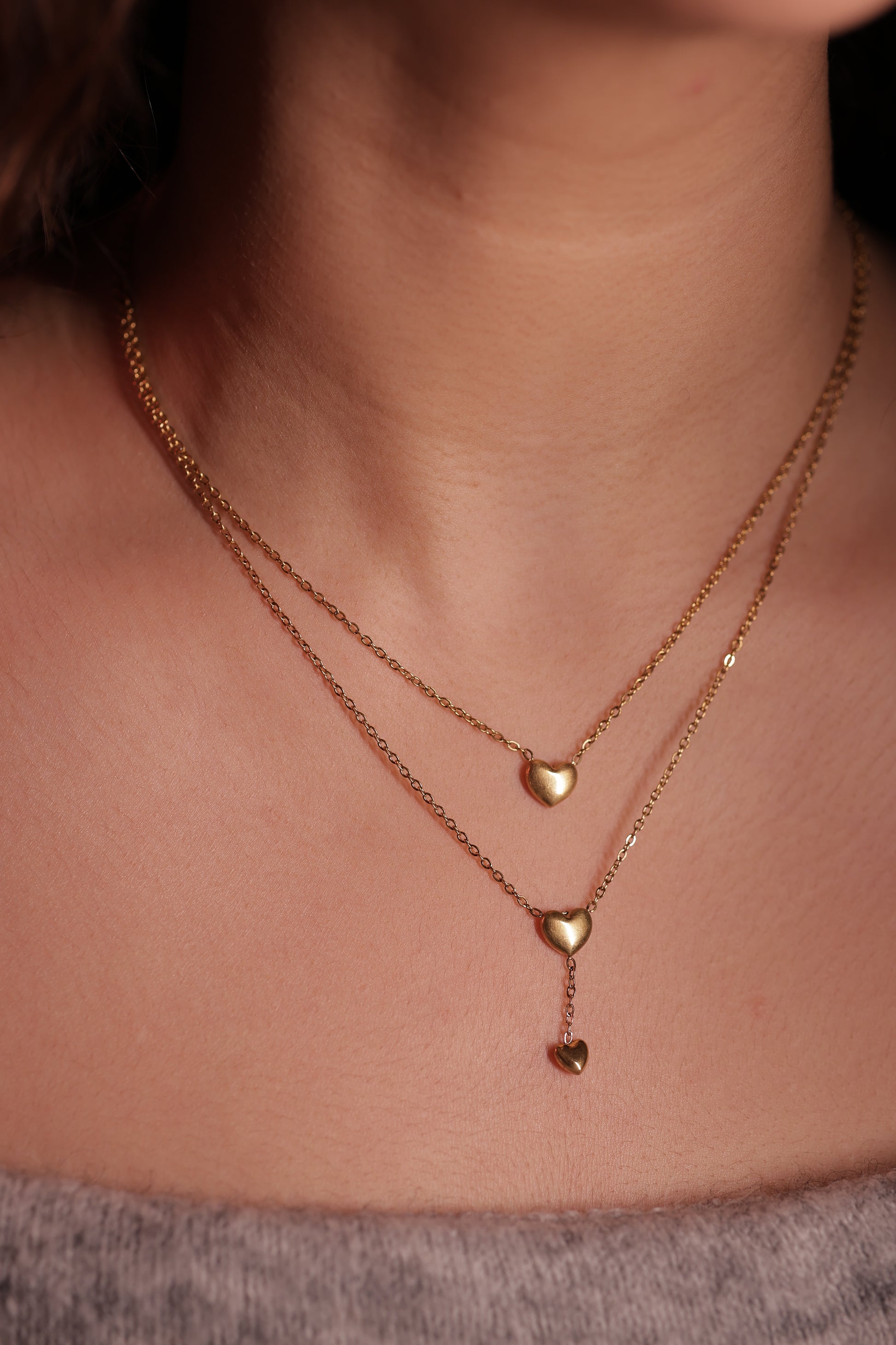 100% anti-tarnish, two string neclace with 3 elegant centre-placed hearts. Made with imported golden alloys. The perfect blend of grace and goth!